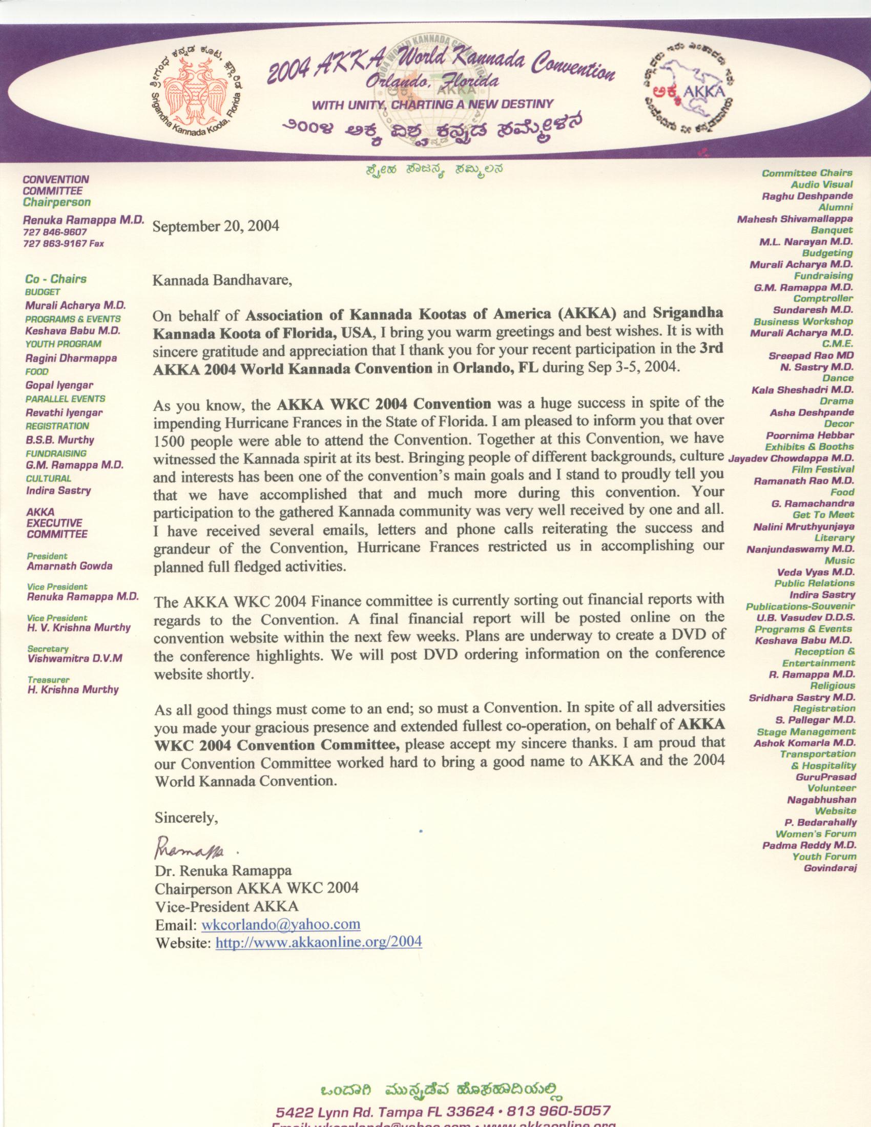 Conference Chairperson's letter: Dr. Renuka Ramappa's letter dated 9/20/2004 to people who attended WKC2004.